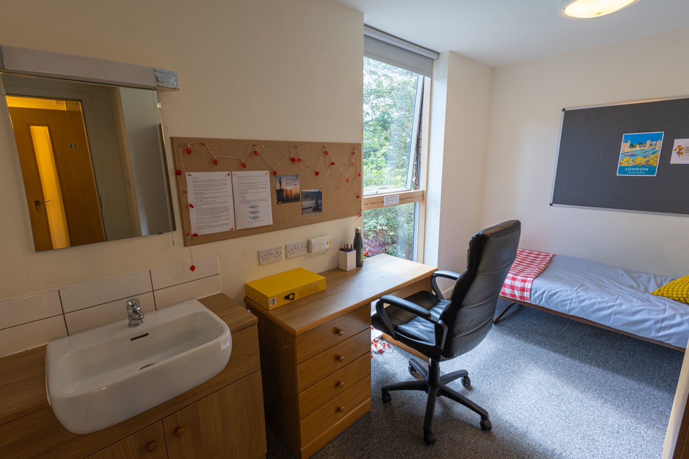 Each room has broadband and comes fully furnished with a bed, wardrobe, bedside cabinet, desk, chair and shelving, and has a lockable door. You even have a washbasin in your room.